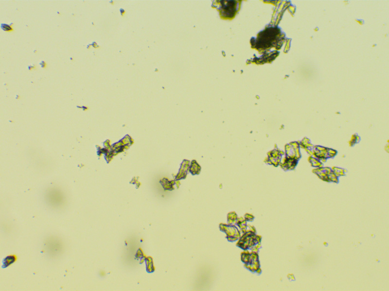 Rys. 4. Pokruszona pastylka zawieszona w wodzie pozostają nierozpuszczalne kryształy obiektyw 40x