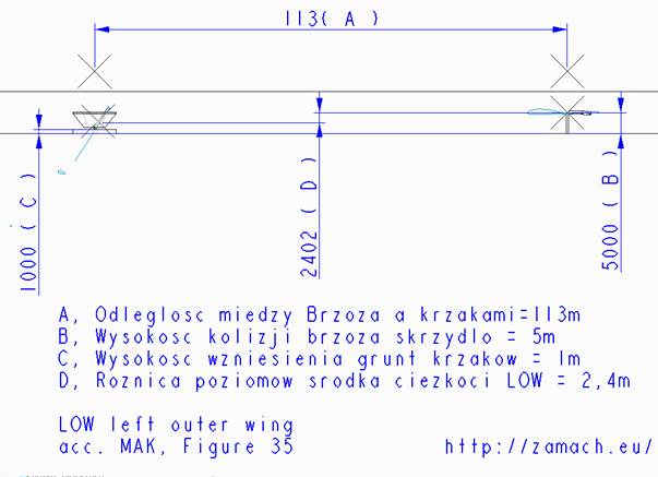 Wg raportu MAK LOW został ucięty po uderzeniu w drzewo – zakładamy, że oznacza to równoczesne oddzielenie LOW od reszty skrzydła. Jest to założenie korzystne dla Gdańska, bo inaczej LOW podążałoby za obrotem w lewo i w dół. Czyli LOW uderzyłoby w ziemię po krótszej drodze lotu, a nie po dłuższej.