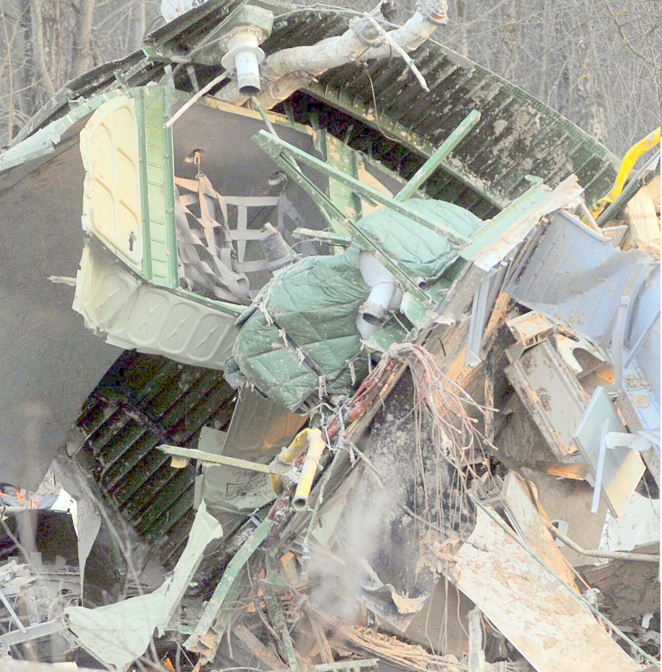 Wrak zgromadzony na złomowisku nie bilansuje się ani wagowo, ani powierzchniowo (blachy pokrycia) z samolotem TU-154m. W sposób rzucający się w oczy brak tam kabiny pilota, która razem z instrumentami jednoznacznie świadczy o tożsamości maszyny (unikalne oprzyrządowanie), co daje przypuszczenie, że wrak ten nie pochodzi od egzemplarza TU154-M101, a tenże brak kabiny jest tu arcyważną przesłanką do takiego przypuszczenia. Wrak wykazuje również łatwo zauważalne braki foteli oraz niedobór wewnętrznych wykładzin(termoakustycznych) kabiny, a które jeżeli się tam znajdowały, to jednie w drobnym fragmencie. Podkreślmy szerzej, nie jest możliwe to, aby samolot został zdetonowany w powietrzu za pomocą „ładunków wielopunktowych”, bo taki wrak rozłożyłby się na ziemi w zupełnie inny sposób. Nigdy nie mógłby się obrócić na „dach” spadając na ziemię z wys. 25 metrów i o dodatkowo silnym kierunku podmuchu wybuchu skierowanego w dół (bo ładunek miał rozerwać górną część kadłuba), jest to oczywisty absurd „aerodynamiczny”. Tego manewru nie mogłyby również zrobić - w identyczny sposób, zsynchronizowane wzajemnie pozostałe części kadłuba, a przy tym zakręcające solidarnie w lewo, bo wymagałoby to uporządkowanych – zsynchronizowanych - sił, które przy takim „wybuchu” są wykluczone).Wynika to z tego, że samolot rozerwany w powietrzu nie jest już ani sterowny, ani spójny, więc nie jest dłużej „logiczny aerodynamicznie” i jego fragmenty nie podlegają wspólnemu zachowaniu w locie (rozpadzie w powietrzu). Idąc dalej należy stwierdzić, że tak rozerwany kadłub nie mógłby wspólnie ani skręcać ani obracać się na plecy. Dodatkowo skrzydło prawe musiałoby spaść na ziemię po prawej stronie osi kadłuba, a nie po lewej, jak to ma miejsce w inscenizacji. Nie byłoby też możliwe, aby przy takiej detonacji „odstrzelona” została część ogonowa - równo na wrędze - z ciśnieniową powłoką, znajdującą się między tylną częścią kabiny pasażerskiej a obszarem zamocowania silników, bo jest to sprzecznie z prawami fizycznymi, które rządzą zasadami konstruowania konstrukcji lotniczych. Kabina samolotu jest formą wytrzymałościową tzw. „walczaka”, który w warunkach zniszczenia przez wzrost ciśnienia pęka na tworzącej tego walczaka, a nigdy po obwodzie i tu jest właśnie taka oczywista sprzeczność. Podkreślmy tu dodatkowo na użytek przeciętnego rozumowania osoby mało „technicznej”, że gdyby fala uderzeniowa od ładunku zainstalowanego w około połowie długości kadłuba rzeczywiście dokonała zniszczenia kadłuba - skutkiem wybuchu - to przecież całe rzędy foteli w ilości 10-15 (licząc do tylu kabiny) zadziałałyby tu jako naturalny tłumik energii tej fali uderzeniowej i część ogonowa nie mogłaby być ucięta tak jak to widać na zdjęciu. Teoria wybuchów jest również sprzeczna z unaocznionym efektem zniszczenia kabiny pilotów, bo kabina ta jest bardzo małej masy i pozostając w proporcjach pędu samolotu jako całości, byłaby – po oddzieleniu od całości - obiektom o relatywnie niższym pędzie (względnym) niż inne luźne fragmenty spadającego wraku. Jako taka, kabina ulegałaby relatywnie niskiemu zniszczeniu. Dodatkowo, kabina pilotów, podobnie do ogona, została oddzielona od całości rury kadłuba „po obwodzie”, a co jest sprzeczne z fizyką w/w. walczaka.